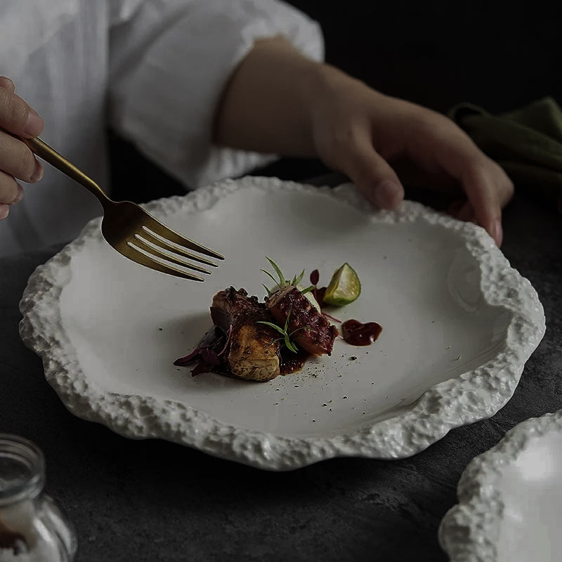 Introducing our Hiroshi white glazed plate collection, perfect for any dining occasion. Hiroshi features a sleek, plain white design with a subtle textured rugged edge, adding unparalleled uniqueness to your table setting. Hiroshi is perfect for someone looking for a simple plate design with a touch of character. Available in four versatile sizes, this set is designed to meet all your dining needs, from appetisers to main courses and finally dessert.