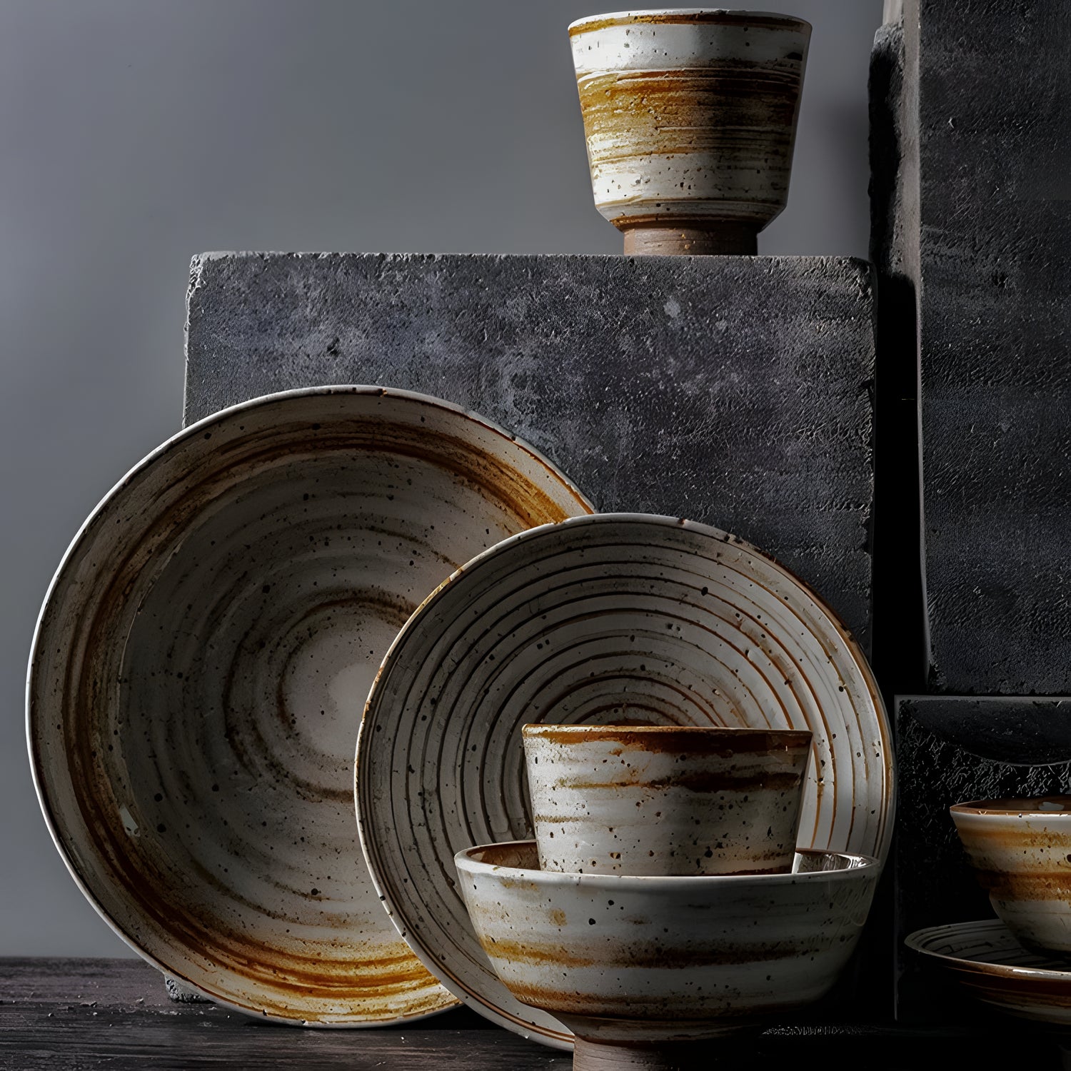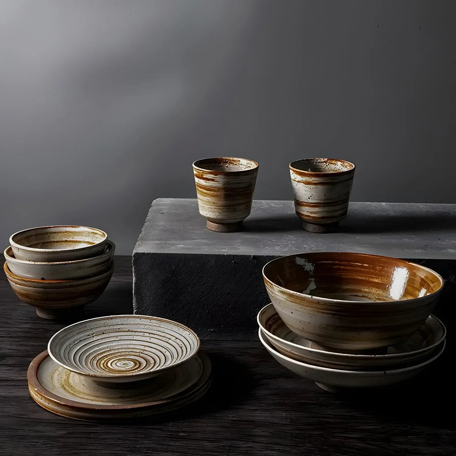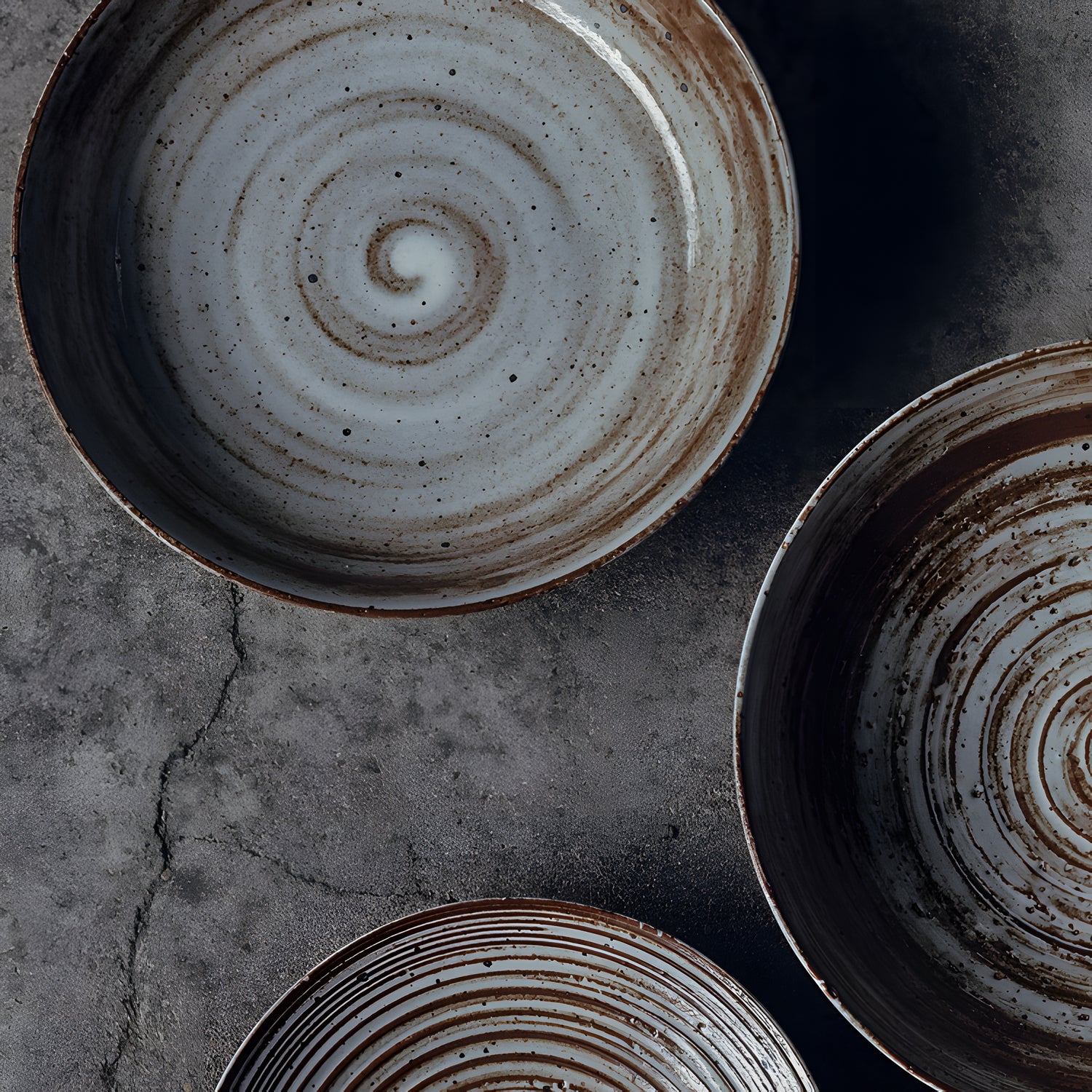 Explore Naomi, designed to infuse your dining moments with rustic charm and artisanal beauty. Naomi features a captivating spiral pattern in earthy tones, evoking the natural elegance of handcrafted pottery. Each plate and bowl, with its unique swirl design, adds character and warmth to your table setting. Available in a cohesive set that includes bowls and cups, Naomi is perfect for serving a variety of dishes, from hearty stews to delicate desserts. The blend of aesthetics and functionality ensures that every meal is a visual delight and a pleasure to enjoy.