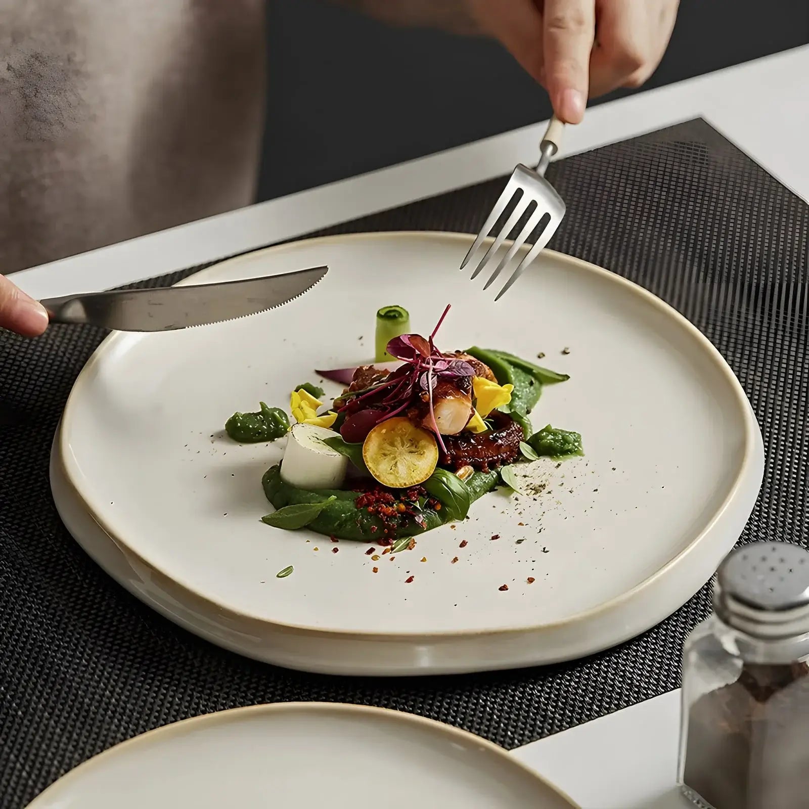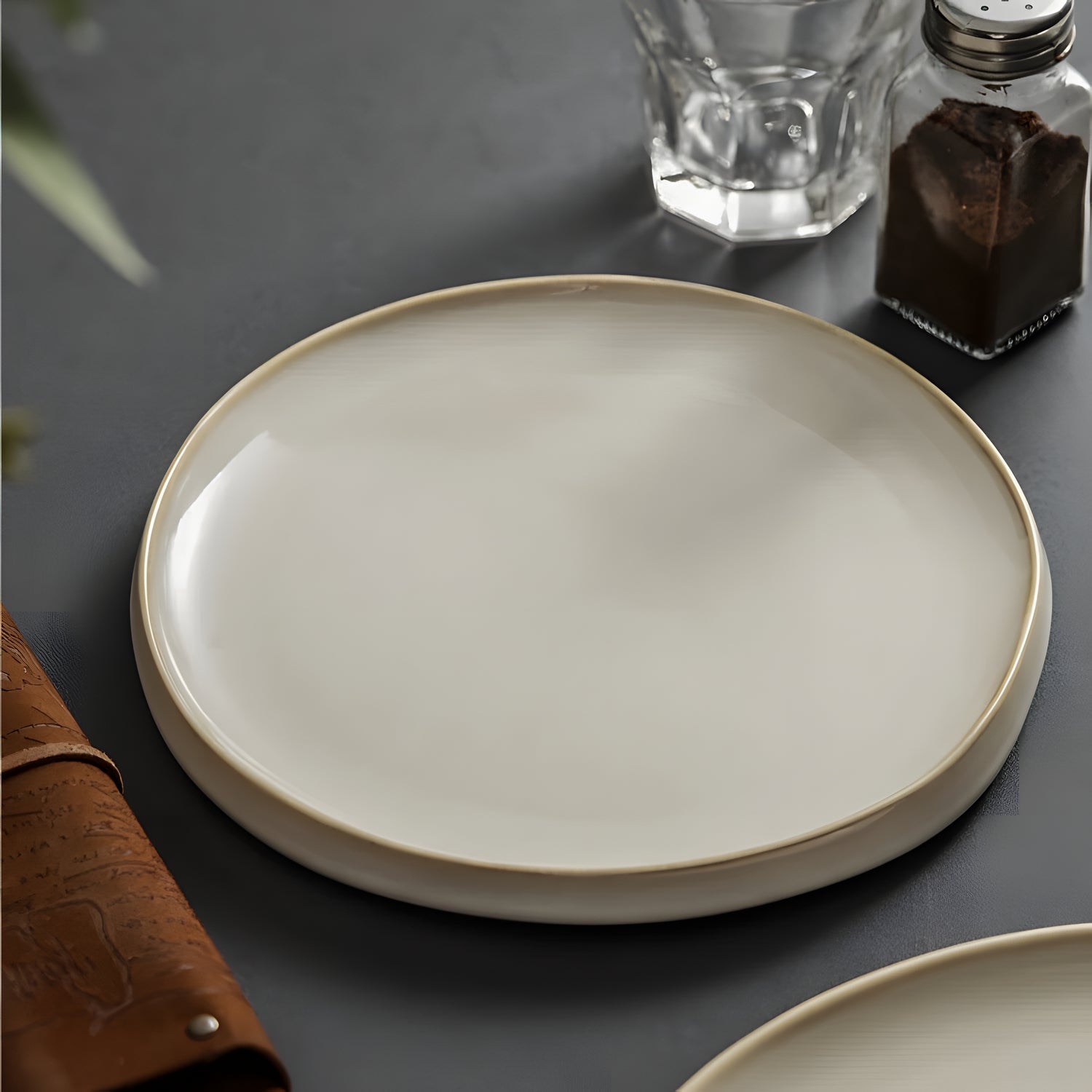 Introduce elegance to your dining table with our Shohei collection, perfect for modern kitchens. This minimalist plate set features sleek, versatile serving dishes designed to complement any décor. Shohei comes in four sizes and feature a warm white colour with a burnt light brown tinge, creating a natural, worn look. The irregular, upturned edges add a unique but functional element. The warm, antique brown touches and the distinctive upturned edges of each plate add a uniqueness to your dining setup while retaining the classic feel of the basic white plate.