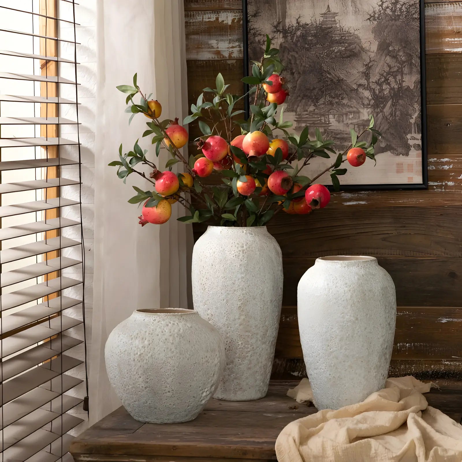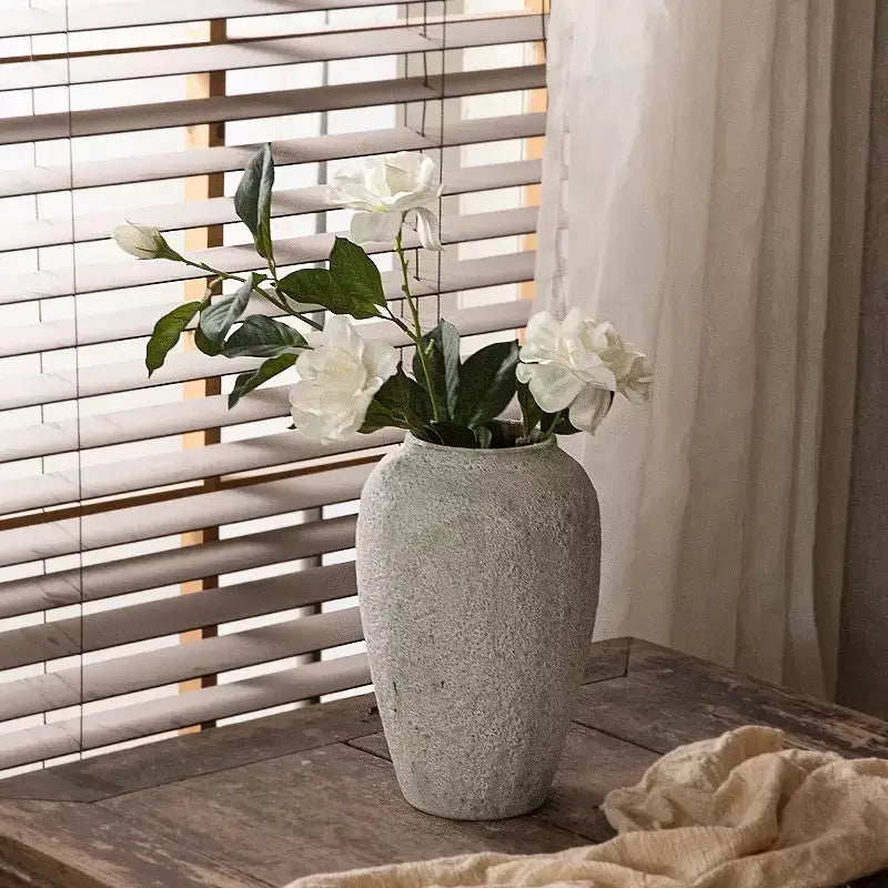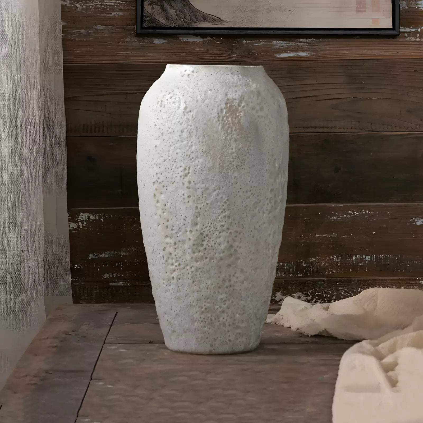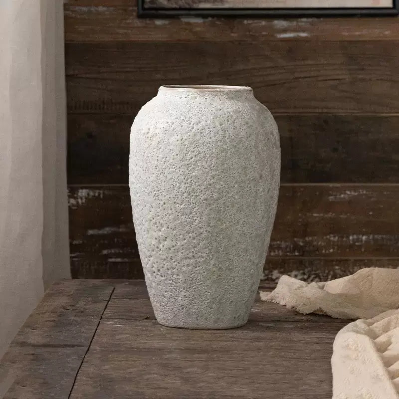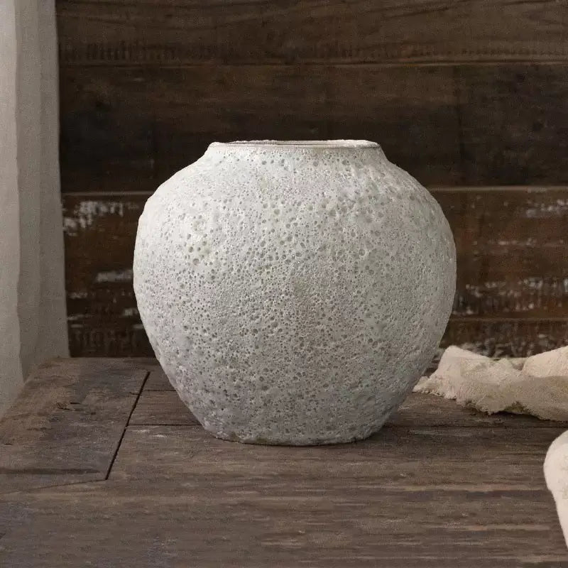 Bring a touch of rustic elegance to your home with our exquisite trio of Takahashi vases, each uniquely crafted to showcase the beauty of natural textures. These vases feature a rough, pebbled surface that adds a tactile dimension and enhances their organic appeal. The neutral, light tones blend effortlessly into any décor, making them versatile enough to complement a variety of settings. Whether displayed individually or as a set, these vases serve as a striking focal point, whether filled with greenery or left unadorned.